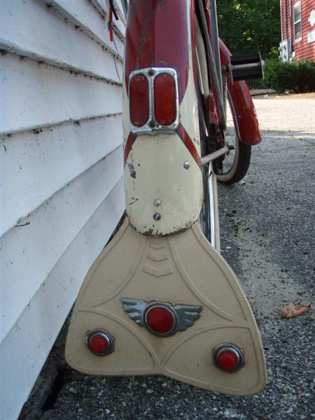 This bike sums up the American attitude toward pedal powered transportation pretty well: it's gaudy, impractical, and you'll only want to ride it a short distance. It's built like a 1950s car. The sheet metal is a gauge never seen on later Muffies. Mufolumbias, actually. The paint, the chrome and the machining show care and investment that also had diminished by the next decade and disappeared in the decade after that. When better bikes were built in this country they borrowed from European designs. Meanwhile the old-school American method rolled on with Huffy, Columbia and Murray. Schwinn had their own twist on it.