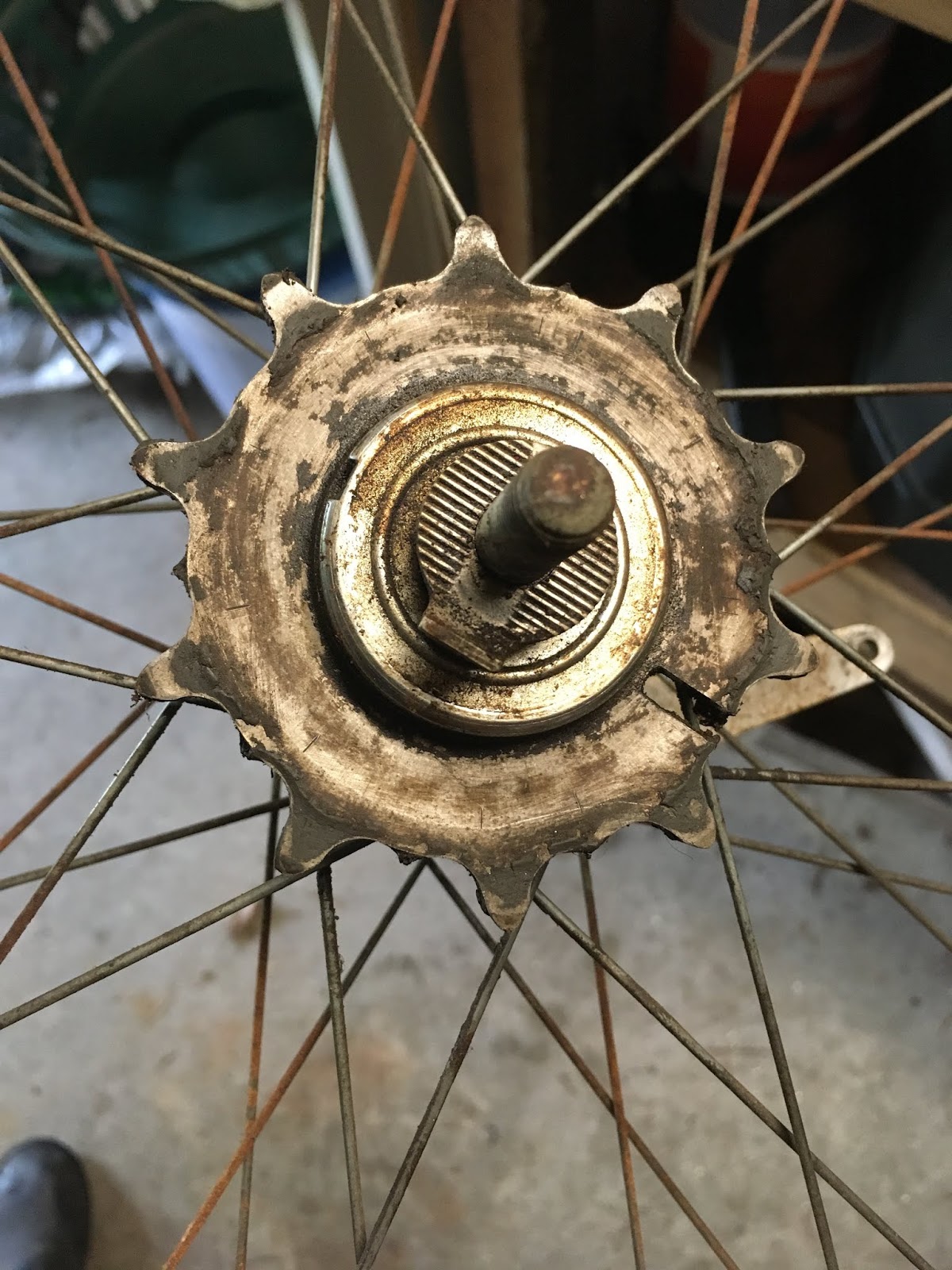 The rear cog and chain ring have the widely spaced teeth typical for its time. By the time I got a bike like this new, in about 1962, they weren't doing this anymore. But my younger friend got her mother's hand-me-down. The bike served two generations of childhood. And now it will serve again as she rides it between two buildings where she works.